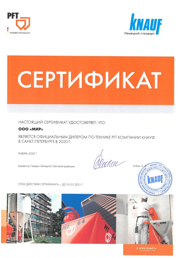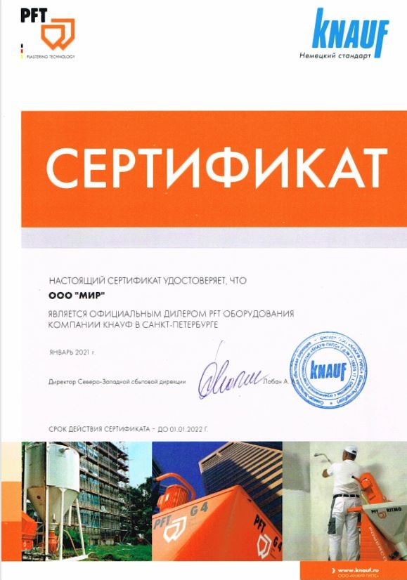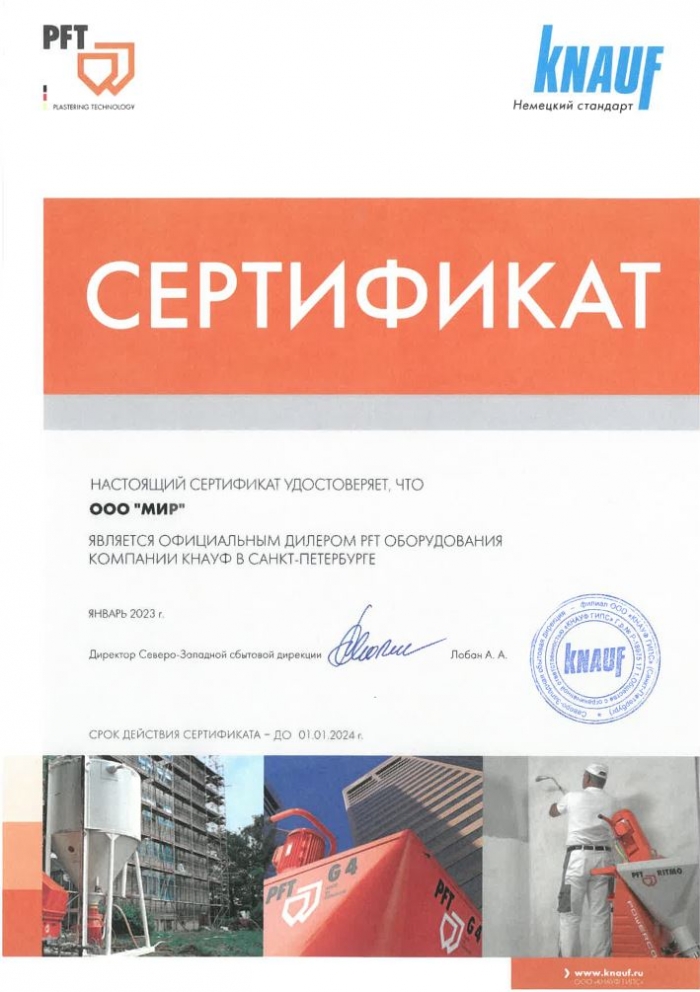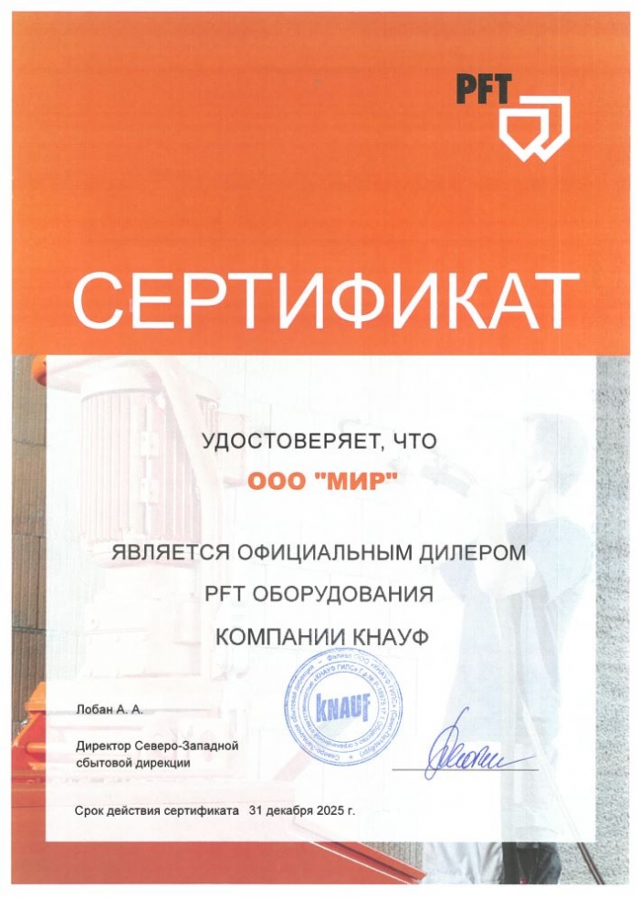 Сертификат дилера Knauf PFT 2025 год!